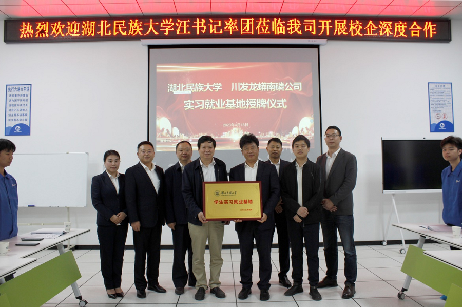 4月19日,学校党委副书记、副校长汪兴平带队赴襄阳市南漳县开展访企拓岗促就业专项行动。汪兴平为龙蟒磷制品有限责任公司副总经理朱洪成颁发客座教授聘书,并为学校“实习就业基地”授牌。2022年9月,学校与南漳龙蟒磷制品有限公司签订校企合作协议,设立化工人才培养基金,开办“龙蟒化工实验班”,先后两届学生在该企业开展毕业实习,已有部分学生选择留企工作。