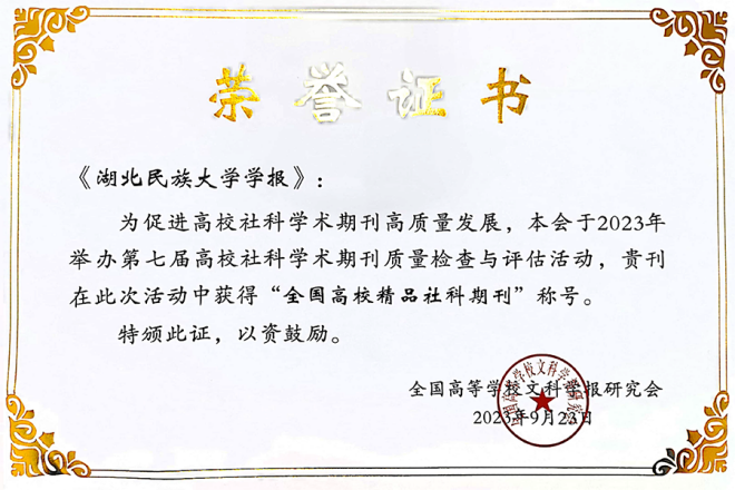 2023年9月,《湖北民族大学(哲学社会科学版)》获评文科学报“全国高校精品社科期刊”称号