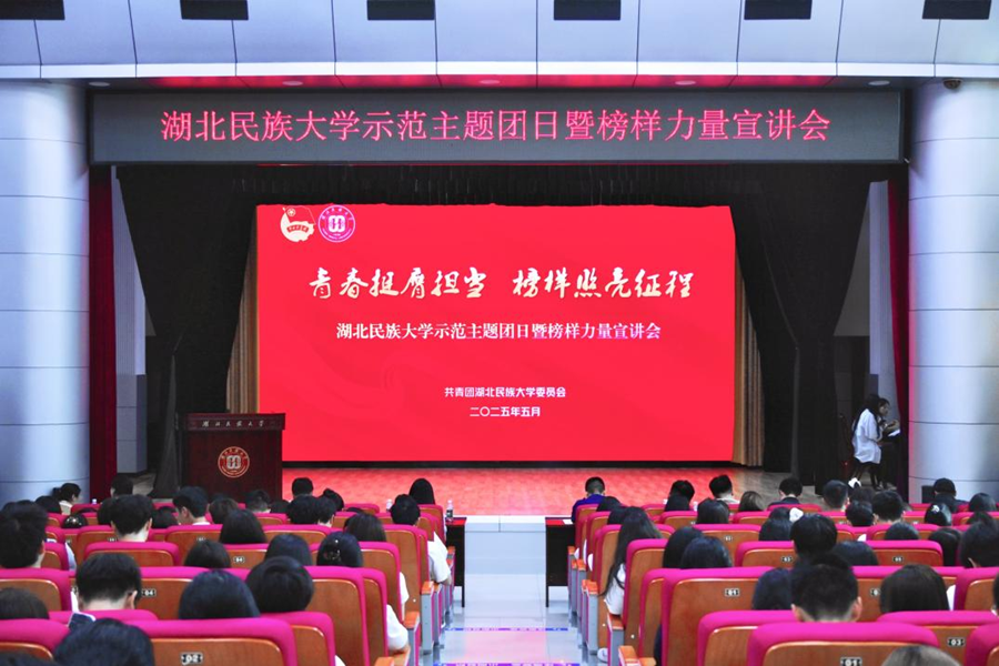 5月22日,湖北民族大学“青春挺膺担当 榜样照亮征程”示范主题团日暨榜样力量宣讲会在行政楼1号会议室举行,2025年春季学期新发展团员以及优秀学生代表共计200余人参加活动。