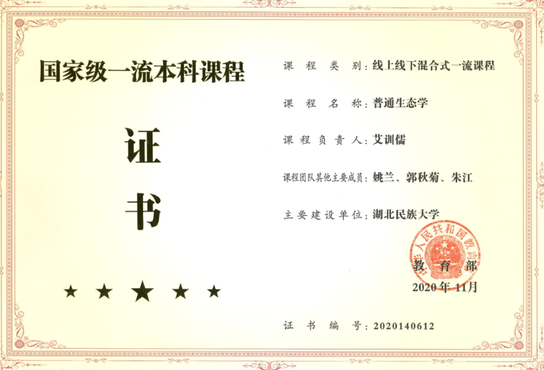 《普通生态学》国家一流本科课程证书